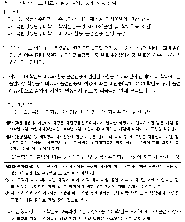 2026학년도 비교과 활동 졸업인증제 시행 알림